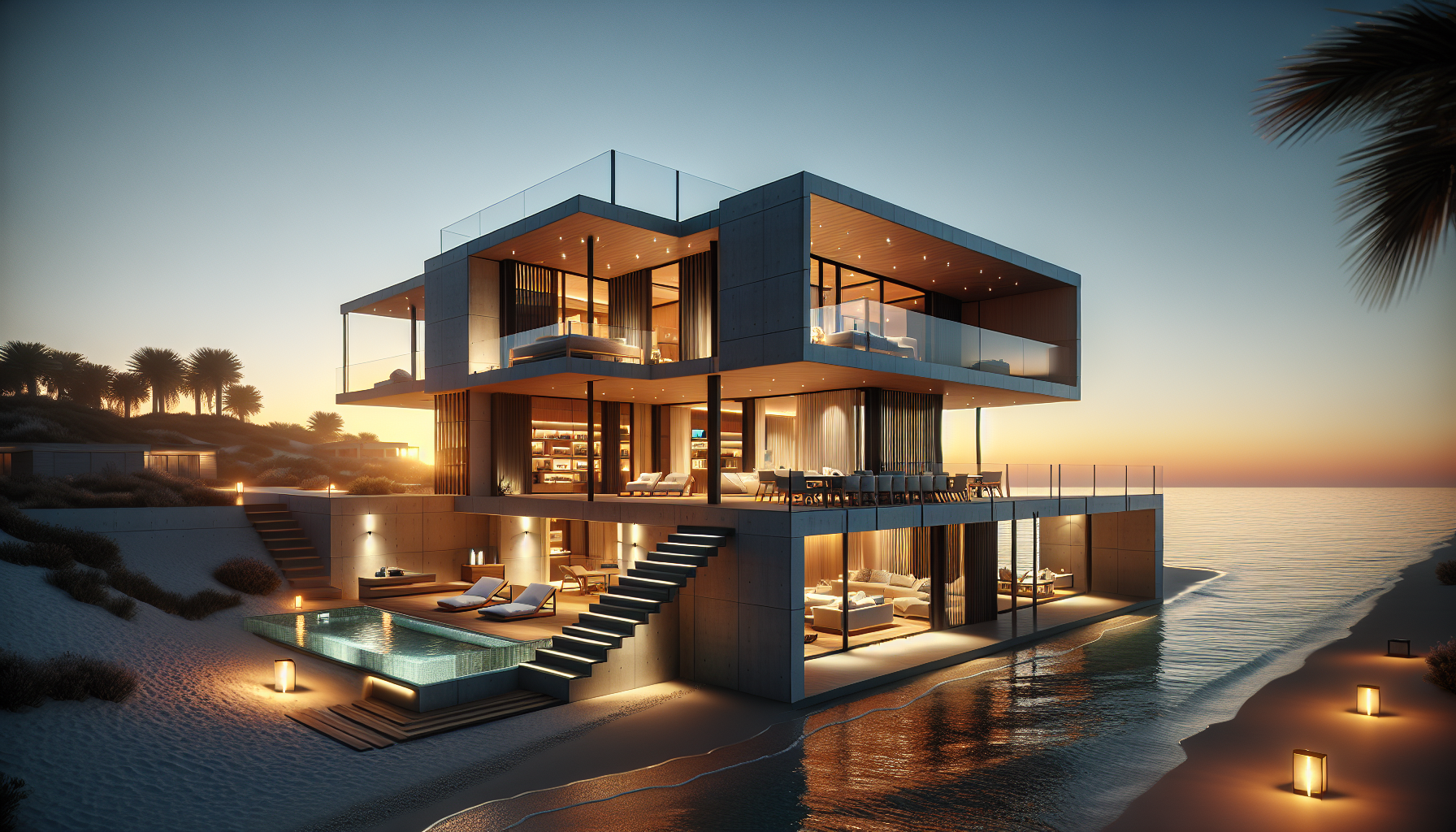 Architectural Visualization of a Modern Beachfront Villa at Sunset, Physically...