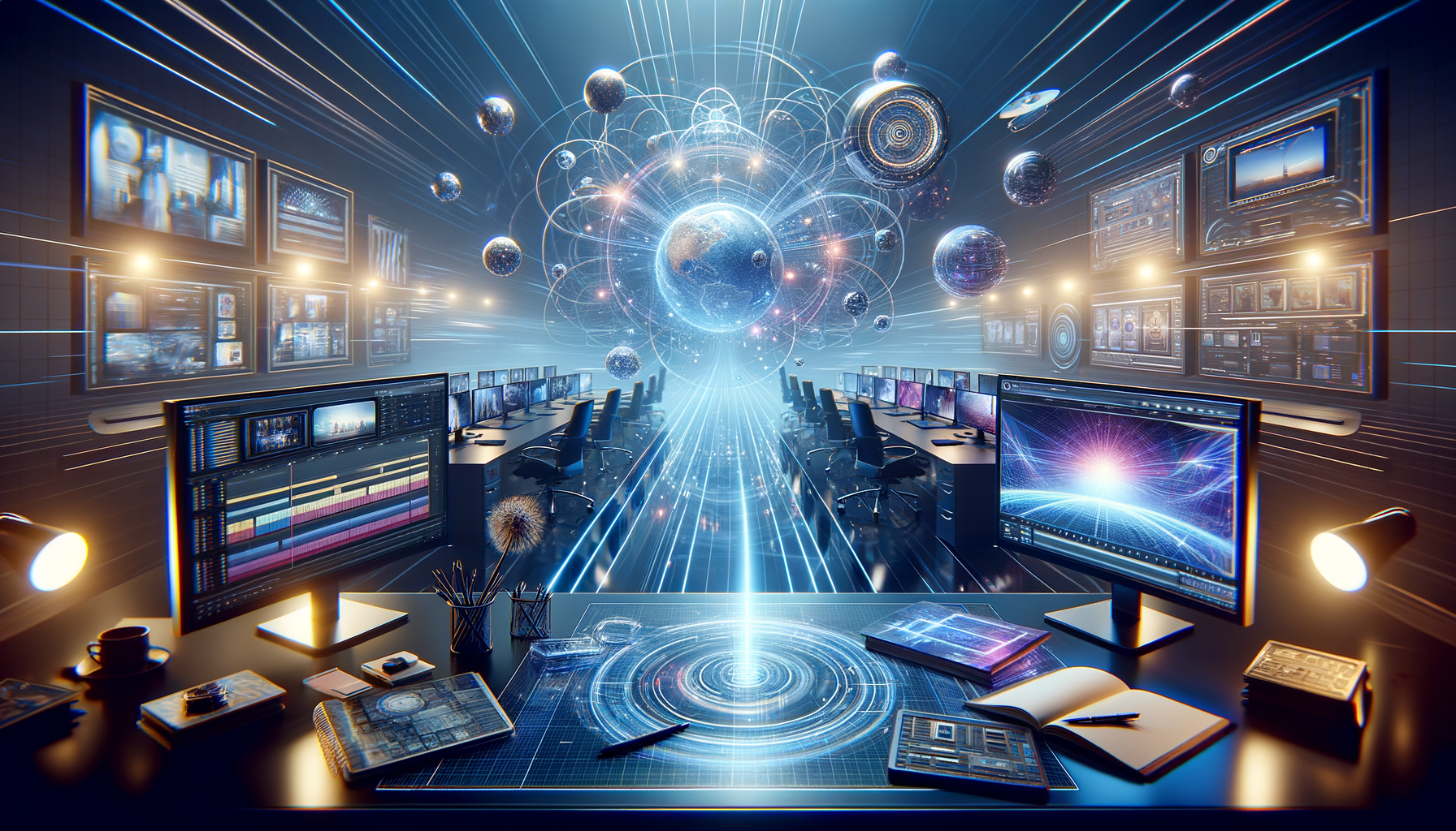 Reuse this promptCinematic premium hero wallpaper for a modern creative platform called AiZity, showing an all-in-one digital ecosystem: floating photoreal 3D product models, elegant website theme mockups on glass screens, a video editing timeline workspace, and an AI image studio gallery connected by glowing data lines around one central creative hub; visual mood is professional, innovative, trustworthy, and high-performance; color direction: sky blue, clean white, subtle indigo and soft purple accents; style: ultra-detailed photoreal 3D + polished UI design, realistic reflections, volumetric lighting, depth, clean gradients, premium campaign look; composition: wide 16:9 desktop wallpaper, balanced scene with strong center focal point and intentional negative space for logo/tagline, no readable text, no people, no watermark, no clutter, ultra sharp 8k. bold stylization, dramatic contrast, rich detail density, premium color grading. wide cinematic composition suitable for banners. batch output 2 of 3, create subtle composition variation while preserving core concept.