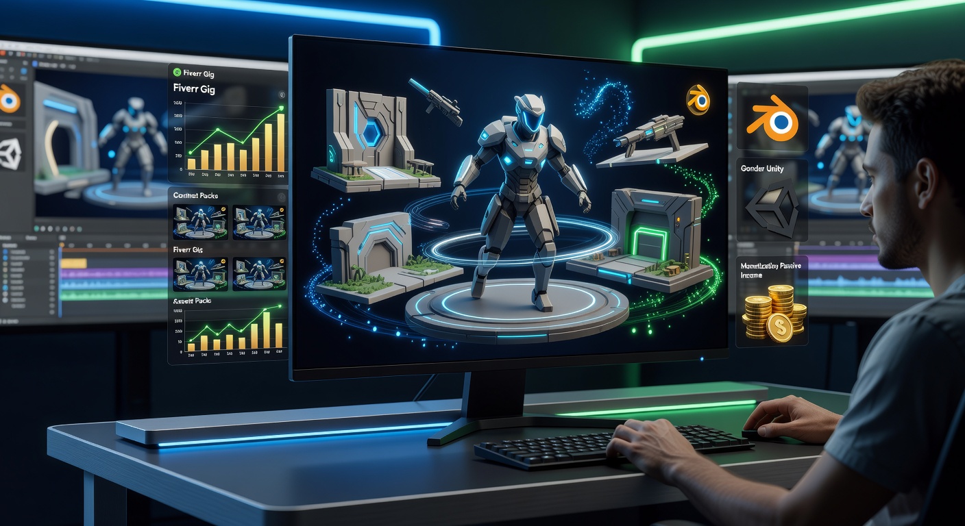 Reuse this promptCreate a cinematic, high-resolution digital illustration in the style of motion graphics and video editing tutorials. Depict a professional content creator at a sleek desk in a modern studio, illuminated by soft blue and green LED lights. On a large computer monitor, showcase vibrant, game-ready 3D models of a futuristic character and environment assets spinning dynamically, rendered in low-poly style with efficient textures. Overlay subtle UI elements like a Fiverr gig page displaying earnings charts and asset previews, with icons of Blender, Unity, and a stack of coins symbolizing monetization. In the background, include blurred screens of video production tools and animation timelines. Use a color palette of cool blues, greens, and accents of gold for a tech-savvy, aspirational vibe, ensuring sharp focus on the 3D models and a sense of motion with particle effects around the assets., professional studio photography, high quality, realistic, professional lighting setup, clean background, product photography style, no words, no watermark, no brand logos