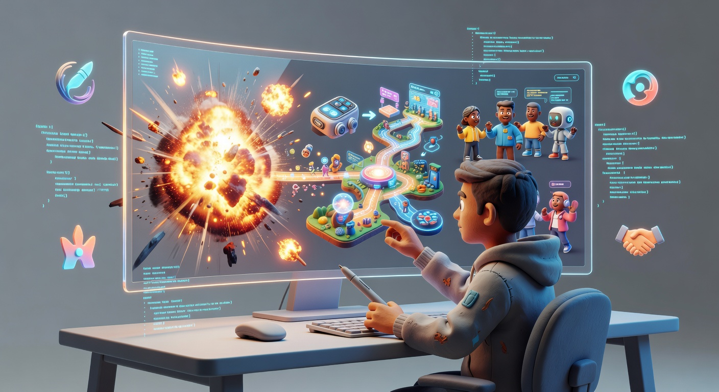 Reuse this promptCreate a cinematic, high-tech digital workspace set in the futuristic year 2026, featuring a young video creator interacting with an intuitive 3D animation interface on a sleek, transparent monitor. The screen vividly showcases lifelike explosions bursting in a gaming scene, morphing product demos evolving into interactive adventures, and AI-powered character animations in real-time collaboration mode. Incorporate subtle holographic elements, glowing code lines, and innovative workflow icons floating around. Render in a professional motion graphics style, incorporating dynamic lighting, vibrant colors, and a mood of effortless creativity, highlighting innovative tools for YouTubers and video producers., claymation style, soft matte surfaces, playful 3D render, studio lighting, no words, no watermark, no brand logos