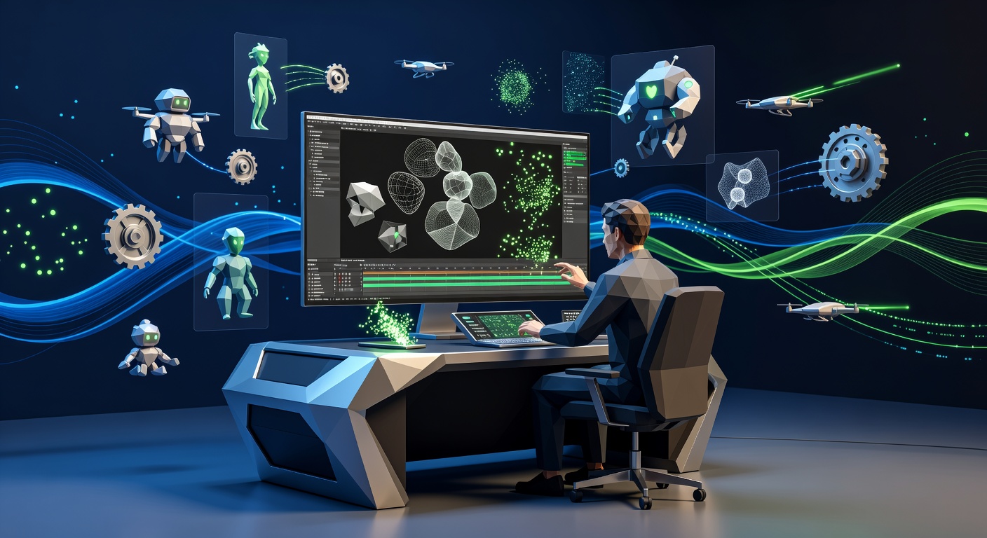Reuse this promptCreate a futuristic, high-tech digital art scene depicting a video creator at a sleek workstation in a modern studio for 2026. The central focus is a large computer monitor displaying 3D animation software with wireframe models, keyframes, and glowing particle effects. Surround the workspace with holographic overlays of animated characters and objects in motion, like rotating gears, flying drones, and morphing shapes. Include subtle motion graphics elements such as flowing data streams and light trails to evoke video editing techniques. Use a color palette of deep blues, neon greens, and metallic silvers for a professional, cinematic vibe. Ensure the composition is dynamic and inspiring, highlighting creativity and innovation in 3D animation for creators., low poly 3D style, geometric facets, clean polygons, modern stylized render, no words, no watermark, no brand logos