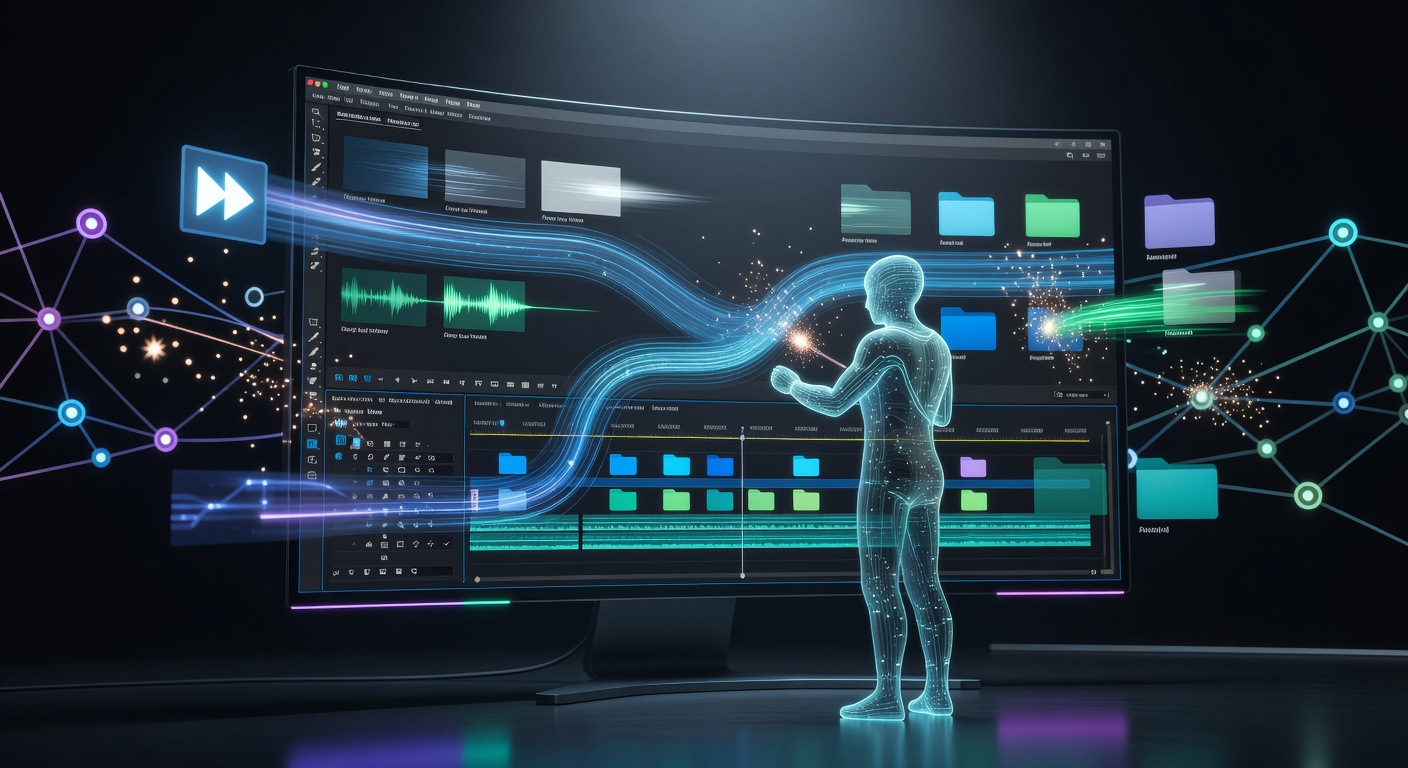 Reuse this promptCreate a professional, futuristic digital illustration of a video editing workflow wizard, depicted as a stylized character in a high-tech studio, organizing video clips, audio files, and assets on a sleek computer screen displaying the Adobe Premiere interface. Illustrate timelines flowing smoothly, folders neatly arranged, and glowing icons of efficiency tools such as fast-forward buttons and creative sparks. Incorporate motion graphics elements: animated transitions, color-coded bins, and a background of interconnected nodes representing streamlined processes. Employ a vibrant color palette with blues and greens for productivity, subtle neon accents for 2026 innovation, in a clean, minimalist style evoking creativity and speed for YouTubers and content creators., cinematic 3D render, dramatic lighting, film-like quality, high-end CGI, cinematic composition, professional 3D animation style, no words, no watermark, no brand logos