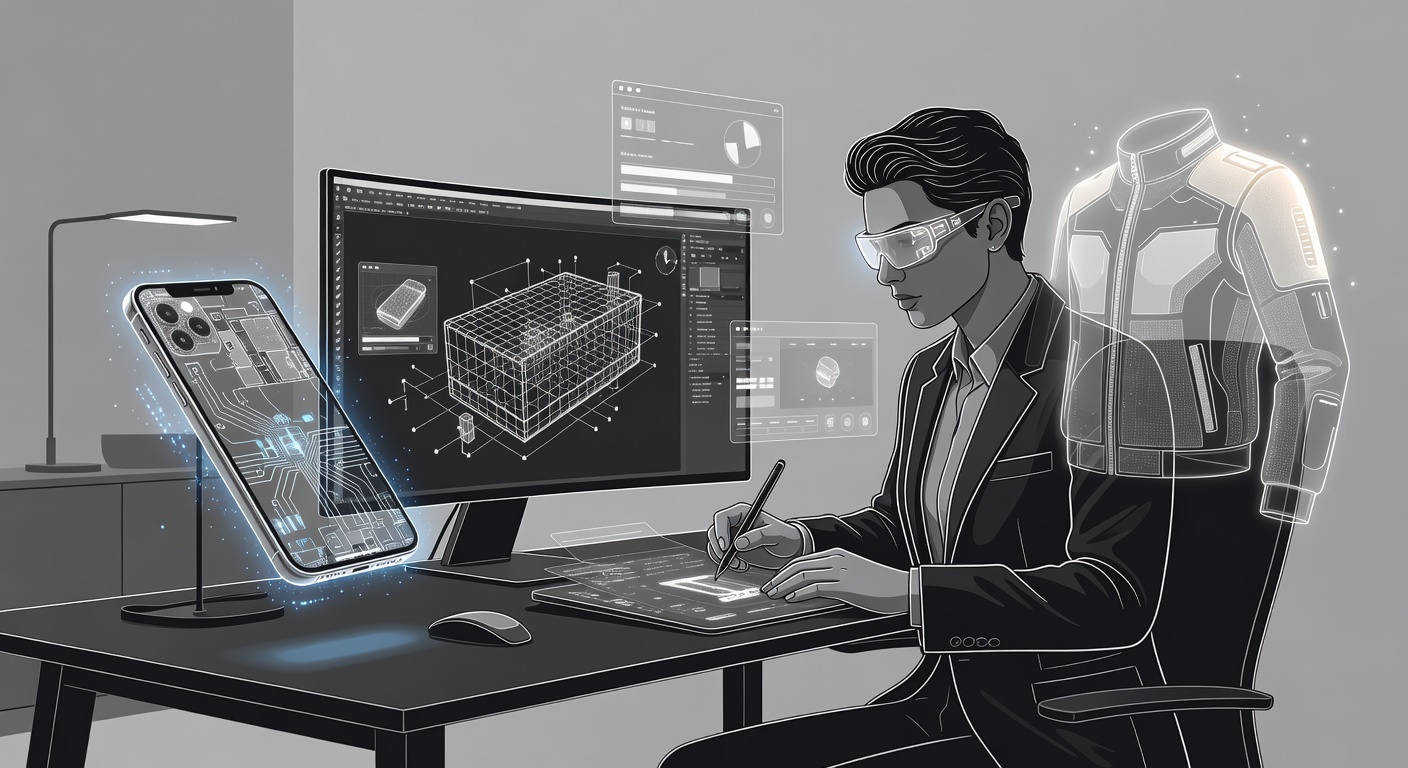 Reuse this promptCreate a professional, high-tech illustration showing a product marketer at a sleek workstation, surrounded by glowing 3D models of consumer gadgets such as smartphones and apparel floating in a virtual environment. The scene features a computer screen displaying polygonal modeling software, with wireframe structures, vertices, and faces being manipulated using intuitive tools. Integrate elements of AI workflows, including automated rendering and video production previews, along with subtle motion graphics effects like rotating objects and dynamic lighting. Employ a futuristic, clean aesthetic in a modern office setting, highlighting creativity and efficiency for marketing campaigns, rendered in a realistic yet stylized digital art style evocative of motion graphics tutorials., minimal line art illustration, clean outlines, simple composition, monochrome style, no words, no watermark, no brand logos