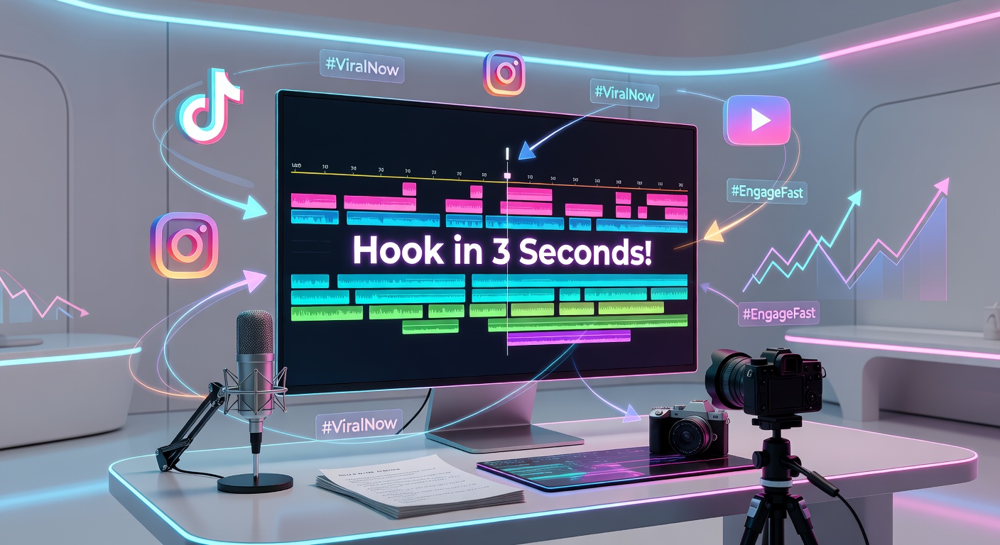 Reuse this promptCreate a vibrant, professional digital illustration depicting a modern video editing workspace in motion graphics style. Feature a sleek computer screen showcasing a short-form video timeline with colorful clips, engaging hooks such as bold text overlays ('Hook in 3 Seconds!'), and social media icons for TikTok, Instagram, and YouTube floating around. Incorporate subtle animations including flowing arrows signifying audience engagement, trending hashtags, and algorithmic optimization graphs. Surround the setup with video production tools like a microphone, camera, and script notes, all set in a clean, futuristic office environment illuminated by soft neon lights and dynamic energy lines to evoke creativity and marketing success. Style: cinematic, high-tech, emphasizing short-form video production trends for 2026., minimal line art illustration, clean outlines, simple composition, monochrome style, no words, no watermark, no brand logos